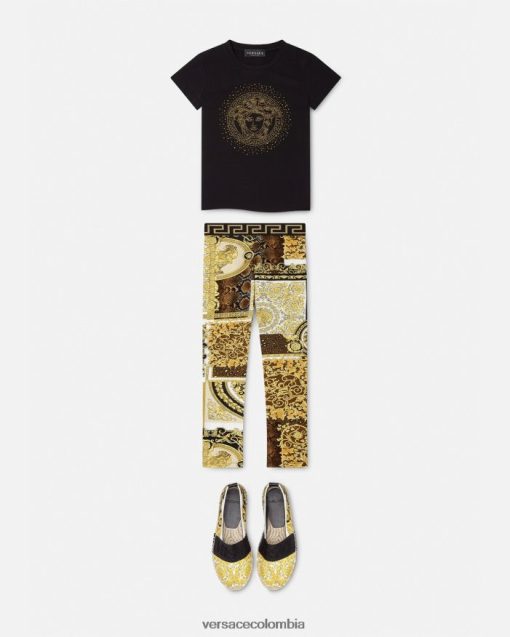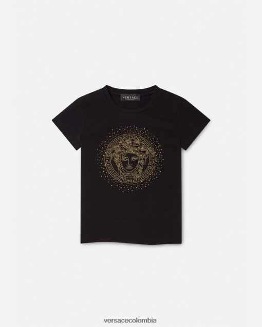 Un básico básico del guardarropa de Versace que añade un toque de diversión a una variedad de actividades, esta camiseta de punto de algodón suave está adornada con un motivo de medusa confeccionado íntegramente con tachuelas doradas.