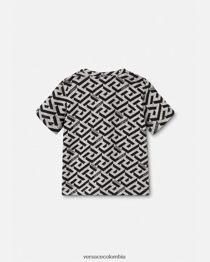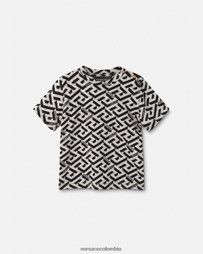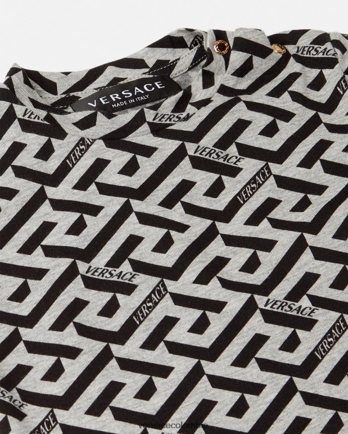 Una camiseta de manga corta para los más pequeños con el estampado La Greca Kids de Versace. Dos botones a presión en el hombro permiten quitarlo fácilmente.