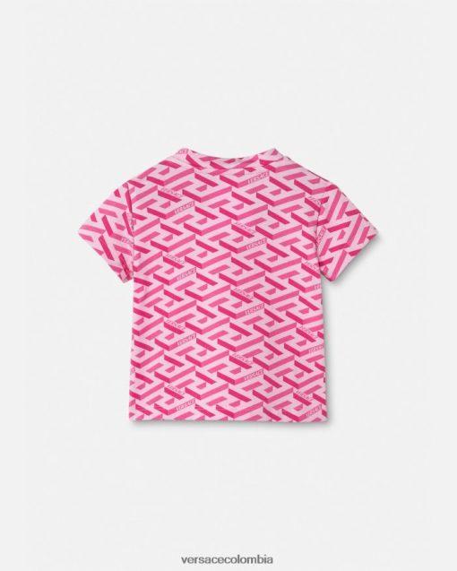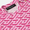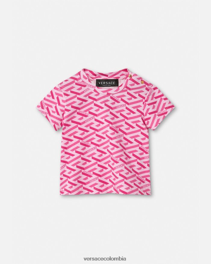 Una camiseta de manga corta para los más pequeños con el estampado La Greca Kids de Versace. Dos botones a presión en el hombro permiten quitarlo fácilmente.
