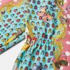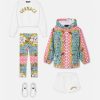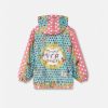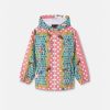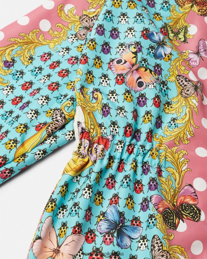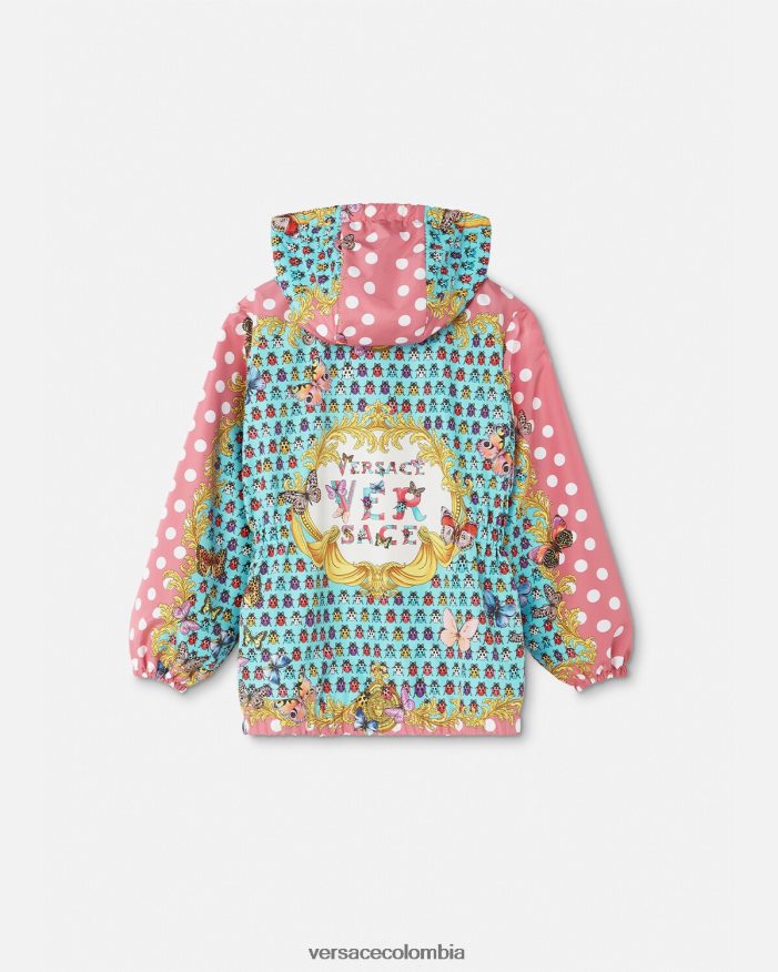 una práctica chaqueta cortavientos con estampado mini yo de mariposas y mariquitas sobre un fondo de lunares y adornos barrocos. Este diseño se completa con una capucha y cintura y puños elásticos.