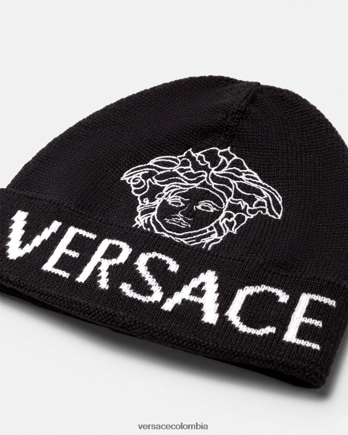 Esta gorra suave, confeccionada con cálido jacquard de lana, presenta un motivo infantil con el logo de medusa y versace.