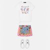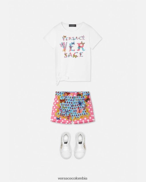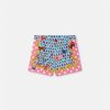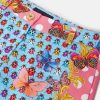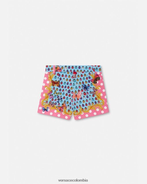 Estos pantalones cortos de mezclilla elástica presentan un estampado integral de miniyo con mariposas y mariquitas sobre un fondo de lunares y adornos barrocos.