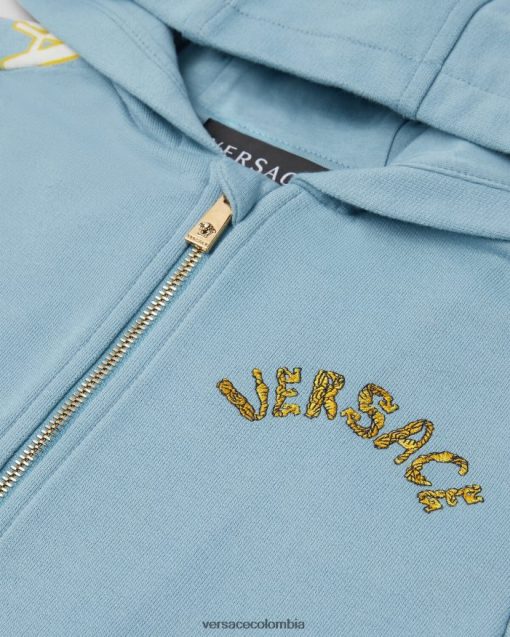 una sudadera con capucha y cremallera confeccionada con punto de algodón y que presenta un logotipo de Versace bordado y un estampado de Versace Kids en contraste en las mangas.