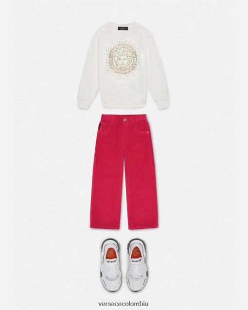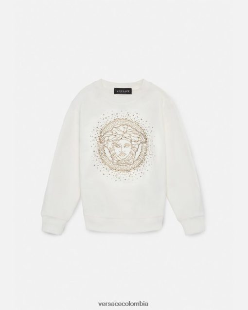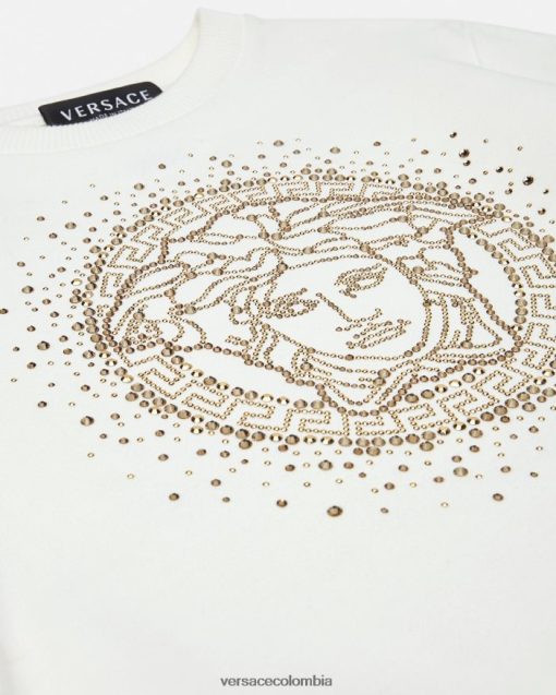 Sudadera versátil confeccionada en punto de puro algodón. El modelo presenta el clásico motivo de Medusa completamente adornado con cristales.
