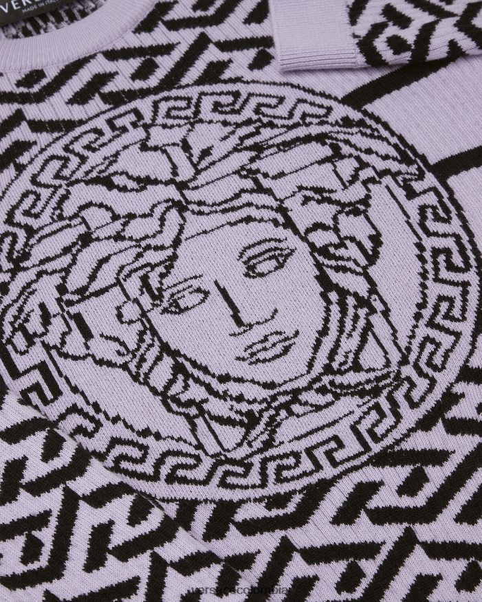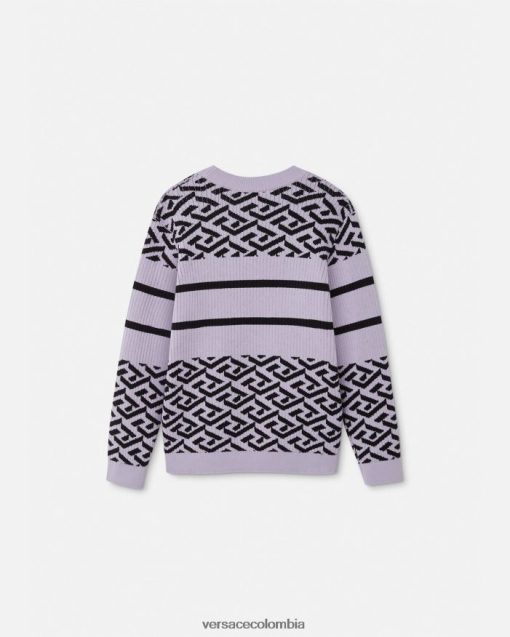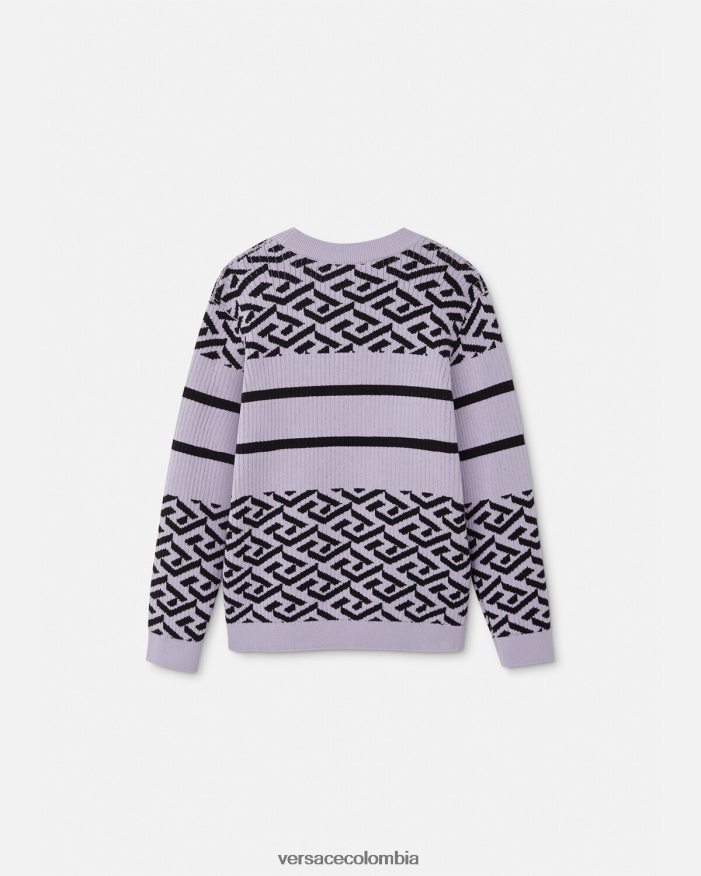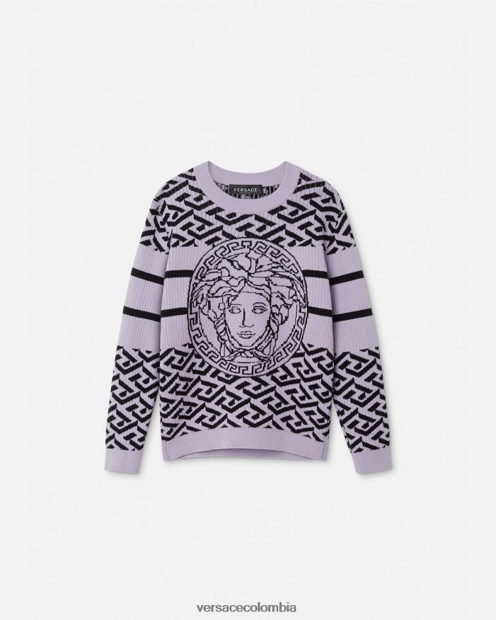 Este suéter de cuello redondo, tejido en jacquard, presenta un motivo infantil de La Greca y Medusa en la parte delantera y ribetes acanalados.