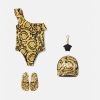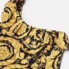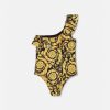 Este traje de baño presenta detalles de volantes y estampado barroco infantil.
