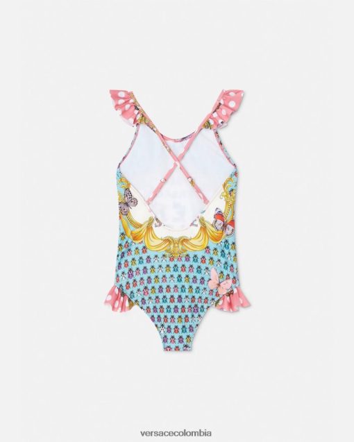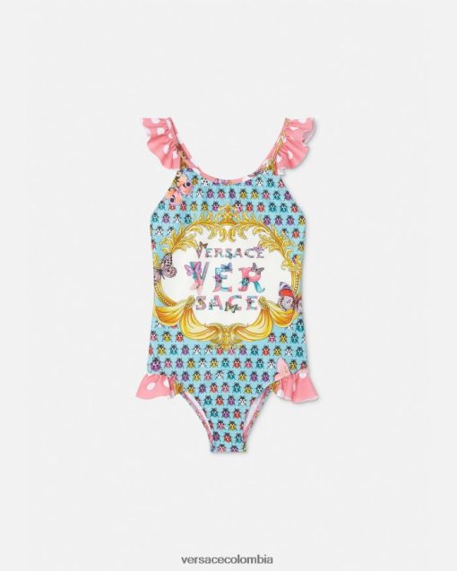 Este traje de baño de una pieza diseñado para días divertidos en la piscina o la playa presenta el divertido estampado infantil de mariposas y mariquitas y adornos con volantes.