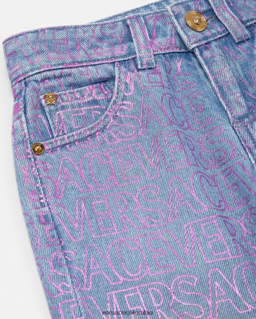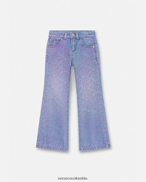 Estos jeans acampanados están confeccionados en mezclilla de algodón y presentan un motivo integral de Versace en contraste con hilos metálicos y detalles metálicos de Medusa.