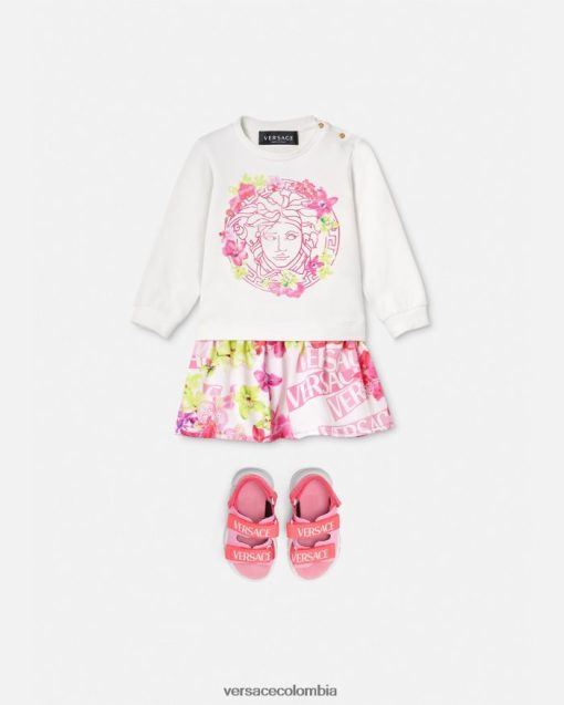 un vestido estilo sudadera con cuello redondo confeccionado con punto de algodón y una falda con estampado de orquídeas para niños con el logo de Versace. Tiene un logo de Medusa en la parte delantera con cierres de botones a presión en el hombro para quitarlo fácilmente.