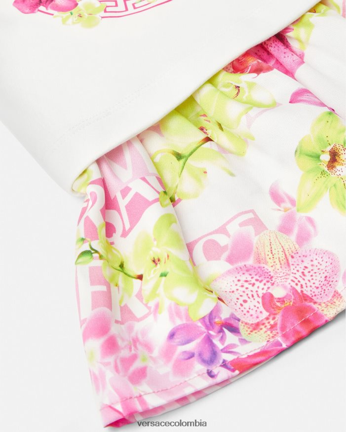 un vestido estilo sudadera con cuello redondo confeccionado con punto de algodón y una falda con estampado de orquídeas para niños con el logo de Versace. Tiene un logo de Medusa en la parte delantera con cierres de botones a presión en el hombro para quitarlo fácilmente.