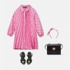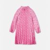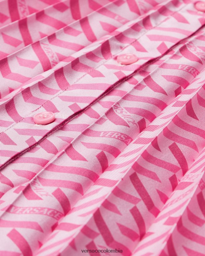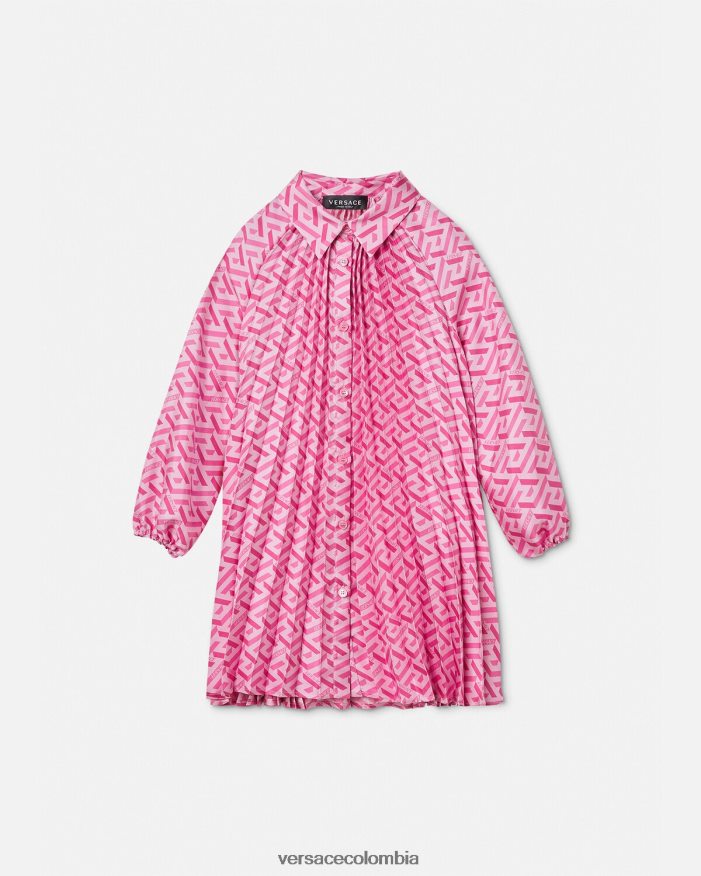 un vestido camisero plisado de manga larga con el estampado de La Greca Kids por toda la prenda. mangas abullonadas, frente abotonado y cuello puntiagudo completan el estilo femenino.