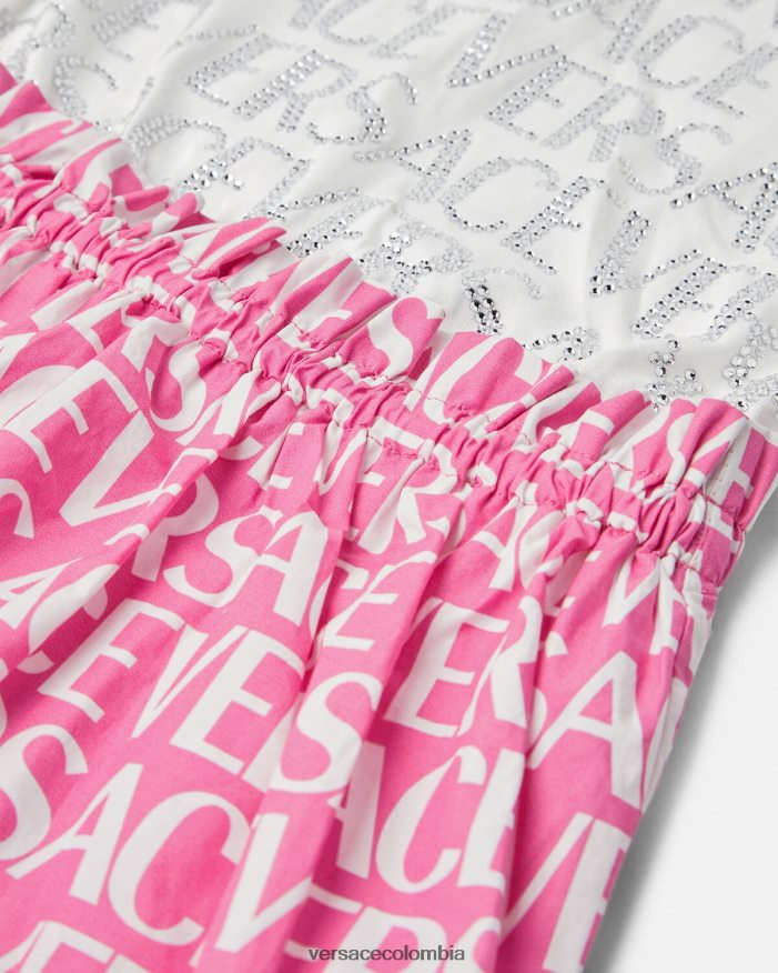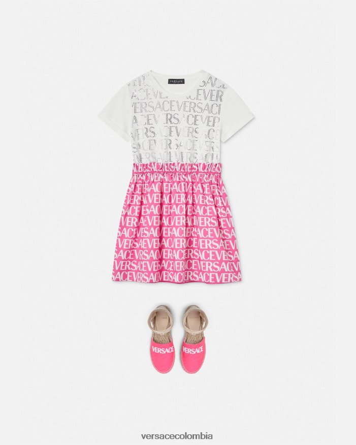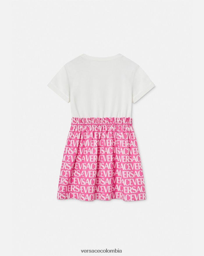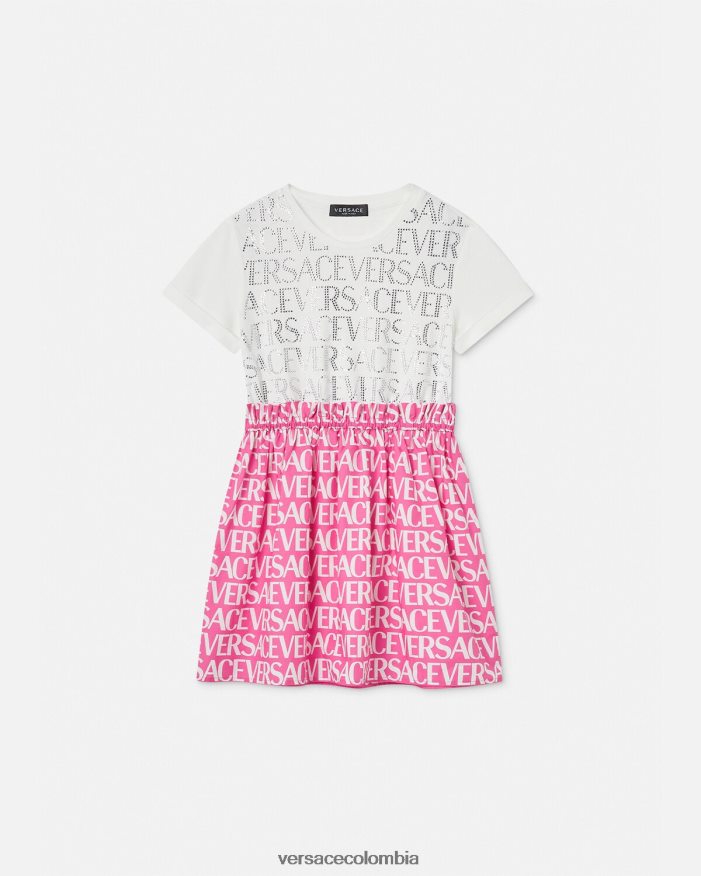 un vestido estilo camiseta con falda estampada de popelina de algodón de Versace Kids y un top de punto de manga corta con adornos de cristal.