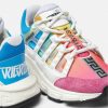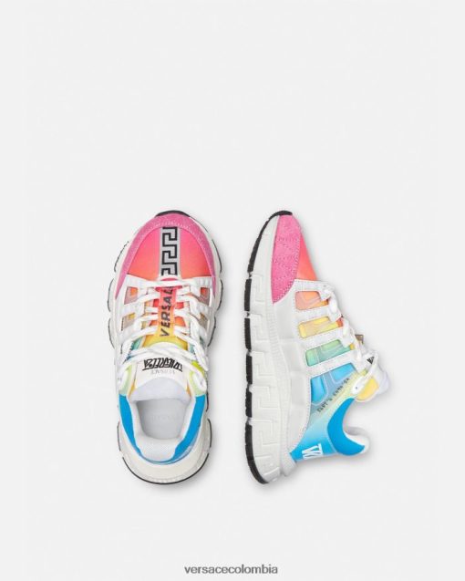 Una mini interpretación de las impactantes zapatillas trigreca de Versace, el par presenta partes superiores de colores del arcoíris con ejecuciones de greca tridimensionales en las suelas y un “sistema de amortiguación de greca” para aterrizajes cómodos.